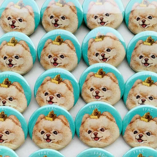 SNSで反響を呼んだ「金印ポメラニアン」の缶バッジはおかげさまで定番となりました!