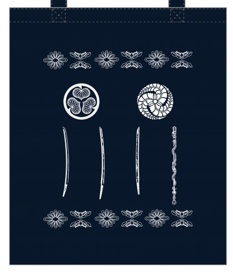 徳川家の家紋と黒田家の家紋、さらにソハヤノツルキ、日光一文字、圧切長谷部、日本号のシルエットをあしらった